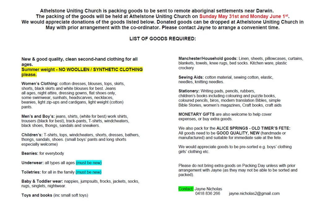Goods can be dropped off at Church on Sunday mornings from April to May each year, or to our office on Tues and Thurs mornings. For alternative arrangements, please contact Jayne, via the Church Office, to arrange for them to be delivered and stored in the shed. If you have any questions please ask Jayne.