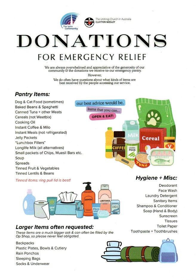 We support the Spire Community Emergency Relief Centre with weekly donations of groceries and cash.